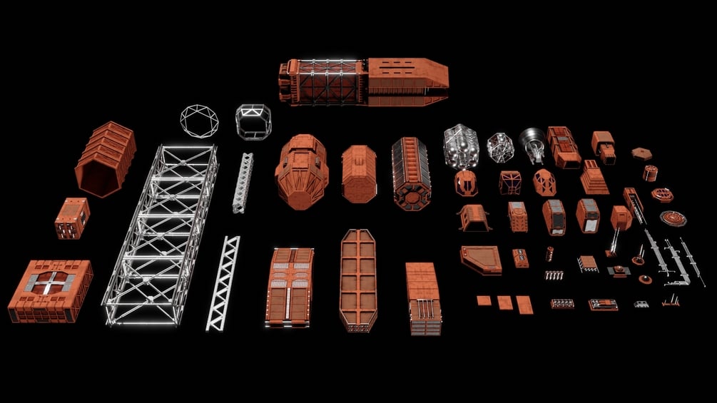 Combine over 50 high quality parts to create all kinds of cruisers, freighters, fighters, and more. Textures are included as well as procedural materials. The hull and metal materials are easy to tweak - change their color, tweak panel size, add scratch, contrast, and bump.